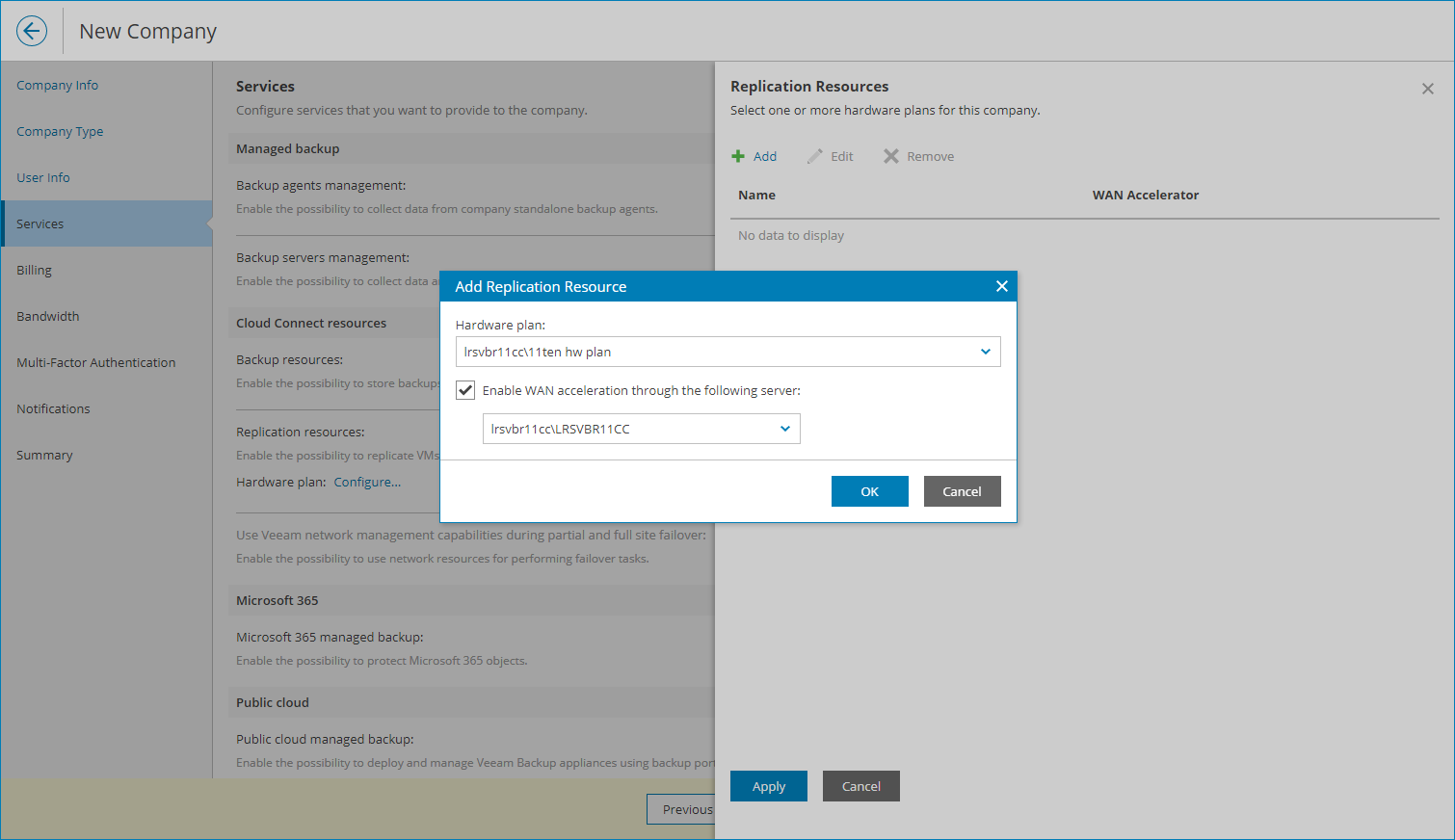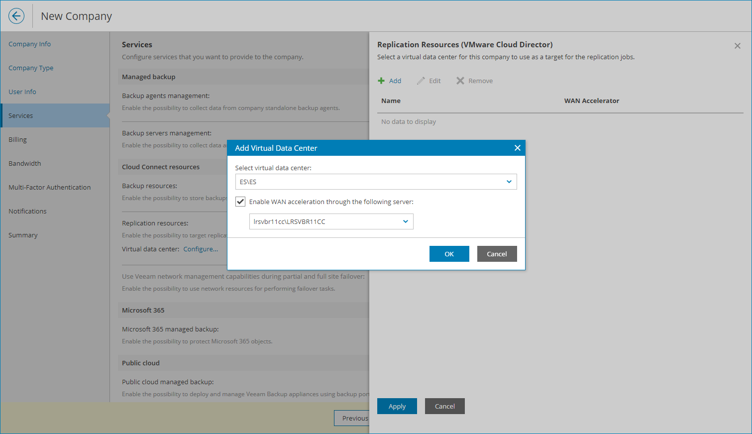 - If the company plans to use WAN accelerators for replication jobs, select the Enable WAN acceleration through the following server check box and choose a target WAN accelerator configured on the service provider side.