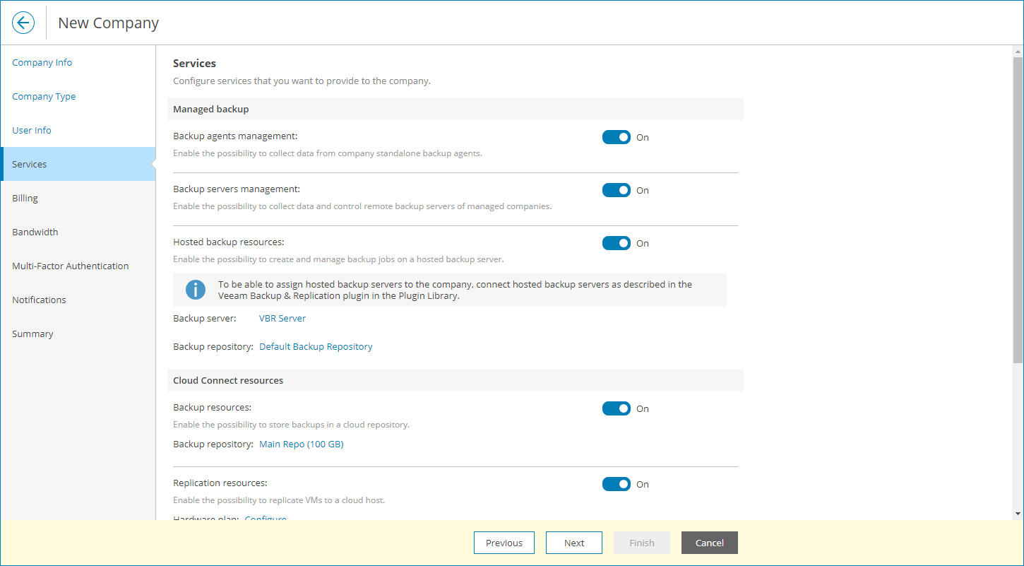 - To allow a company to manage Veeam Backup & Replication servers, Veeam backup agents managed by Veeam Backup & Replication servers and Veeam Backup for Public Clouds appliances, set the Backup servers management toggle to On.