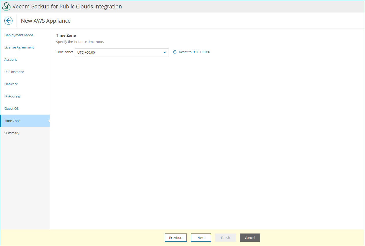 - At the Time Zone step of the wizard, specify the EC2 instance time zone.