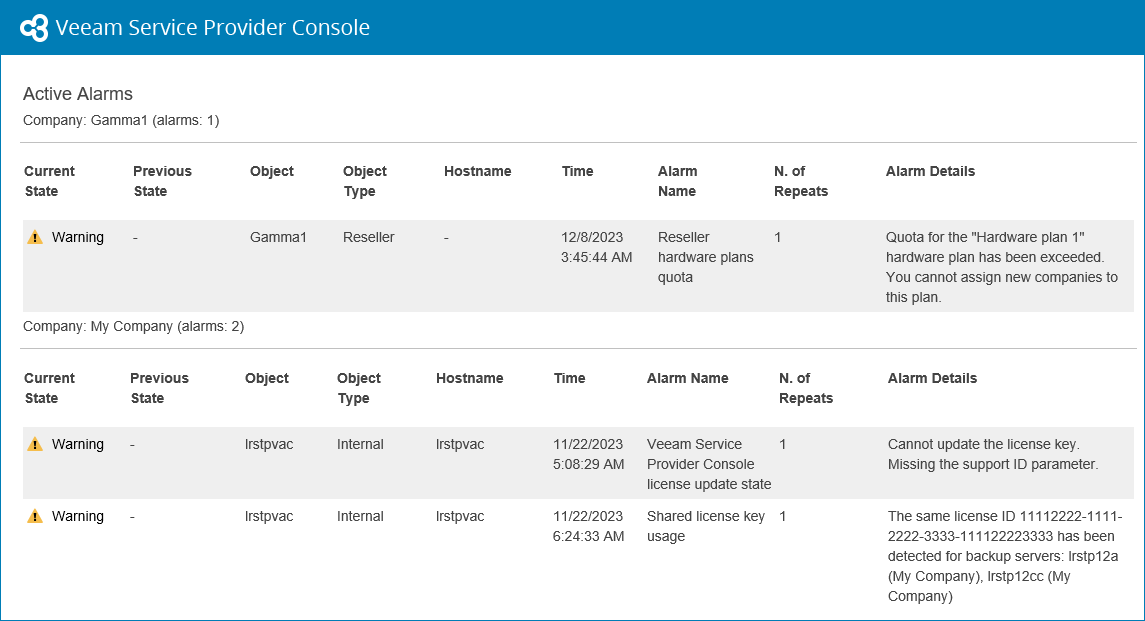 Veeam Service Provider Console can send two types of email notifications about alarms: