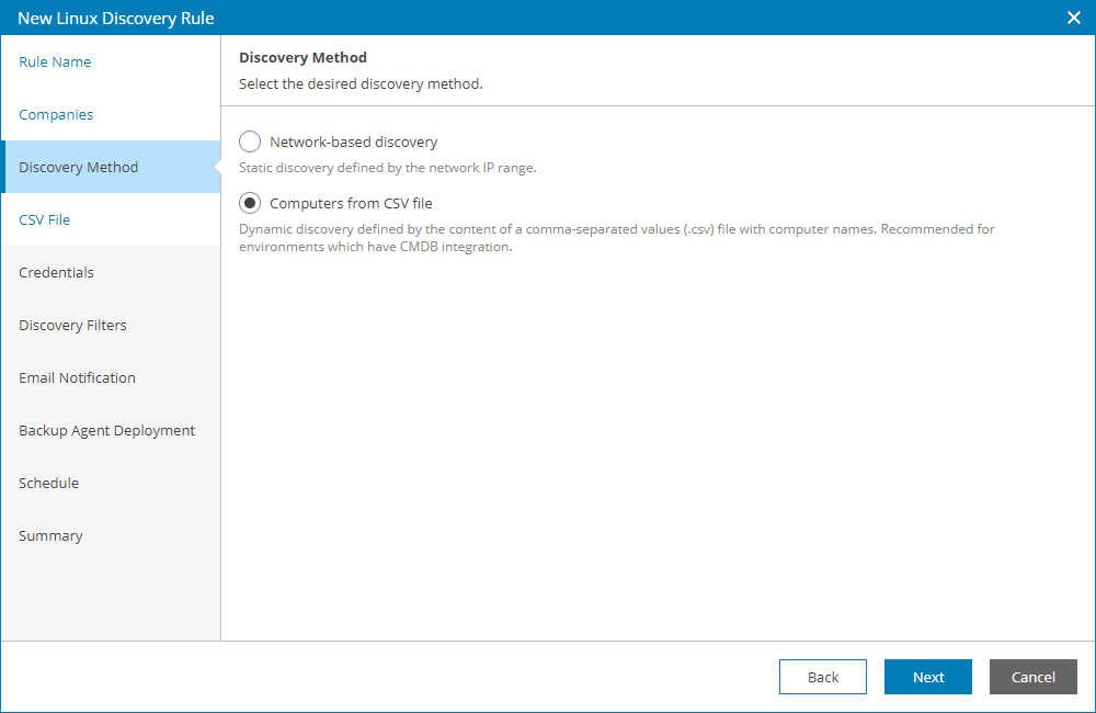- At the Discovery Method step of the wizard, select Computers from CSV file.