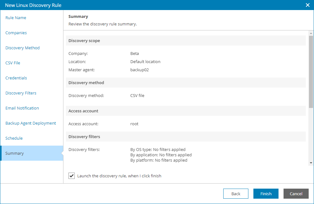 - To start discovery after you save the rule, select the Launch the discovery rule when I click Finish check box.