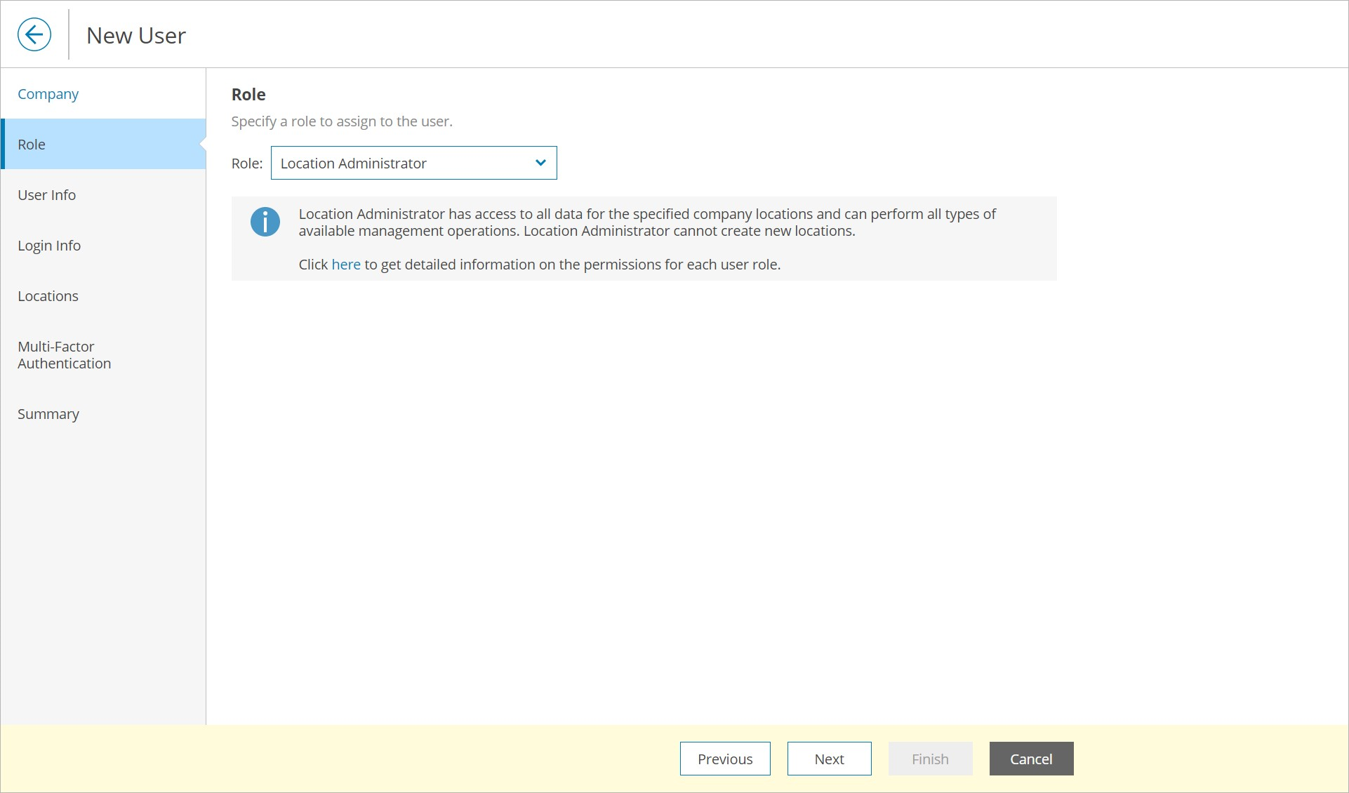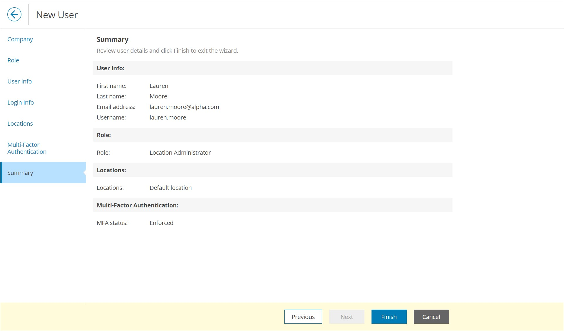 - At the Multi-Factor Authentication step of the wizard you can assign a second authentication factor to the new user. For details on MFA, see Configuring Multi-Factor Authentication.