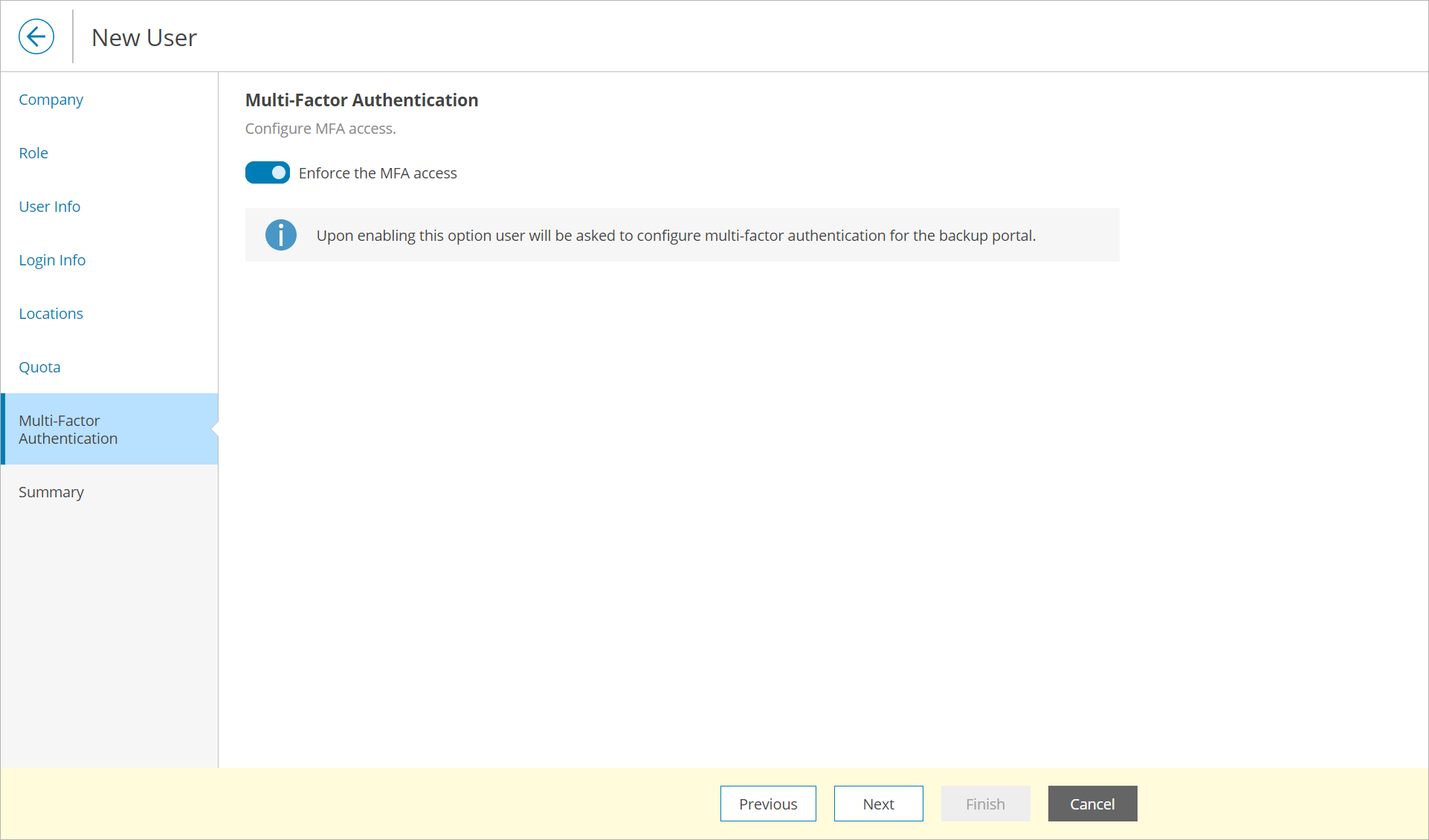 To enable MFA for the new user, set the Enforce the MFA access toggle to On. On the next authorization session, the user will be prompted to configure MFA.