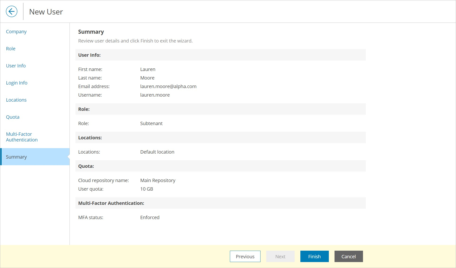 - At the Summary step of the wizard, review user details and click Finish.