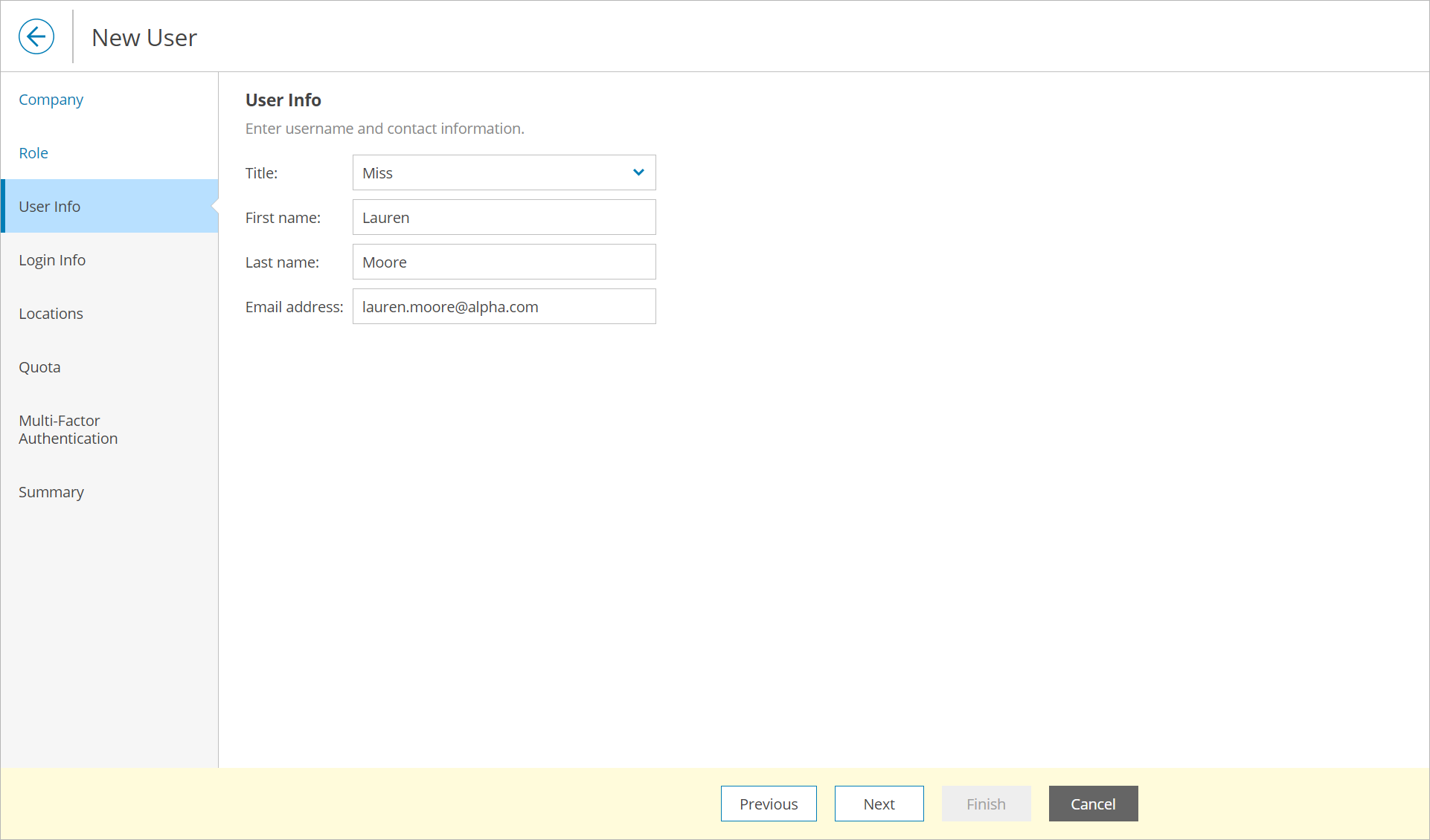 - At the User Info step of the wizard, specify user title, first name, last name and email address.