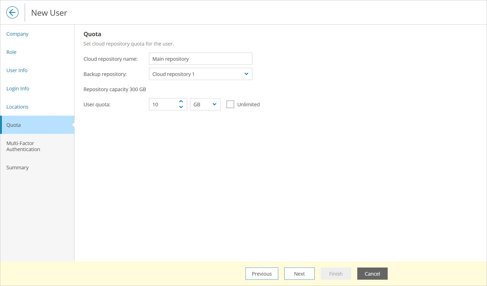 - At the Quota step of the wizard, allocate cloud repository resources to the user.