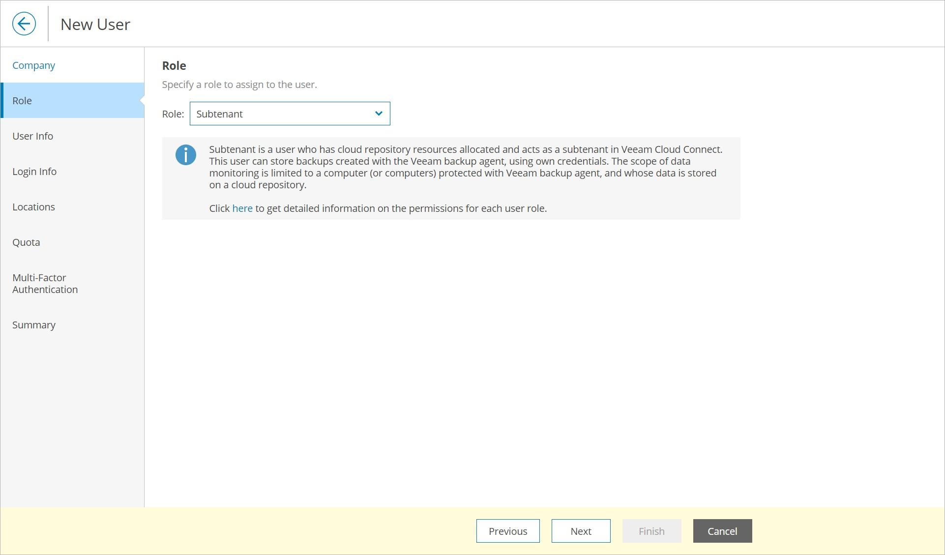 - At the Role step of the wizard, choose Subtenant.