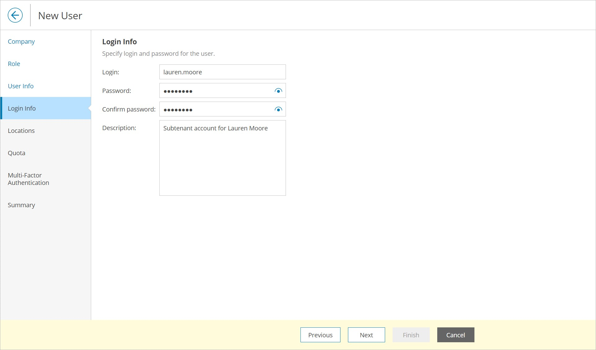 - At the Login Info step of the wizard, in the Login, Password and Confirm password fields, type a user login name and password.