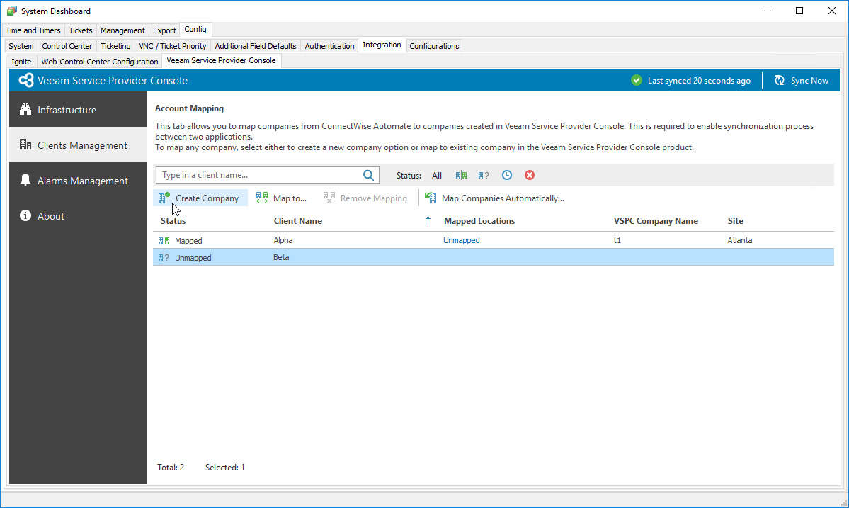 - From the list of clients, select unmapped ConnectWise Automate clients for which you want to create companies in Veeam Service Provider Console.