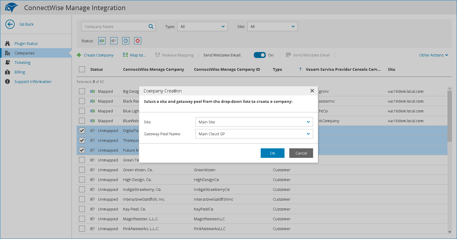 - From the list of companies, select unmapped ConnectWise Manage companies for which you want to create companies in Veeam Service Provider Console.