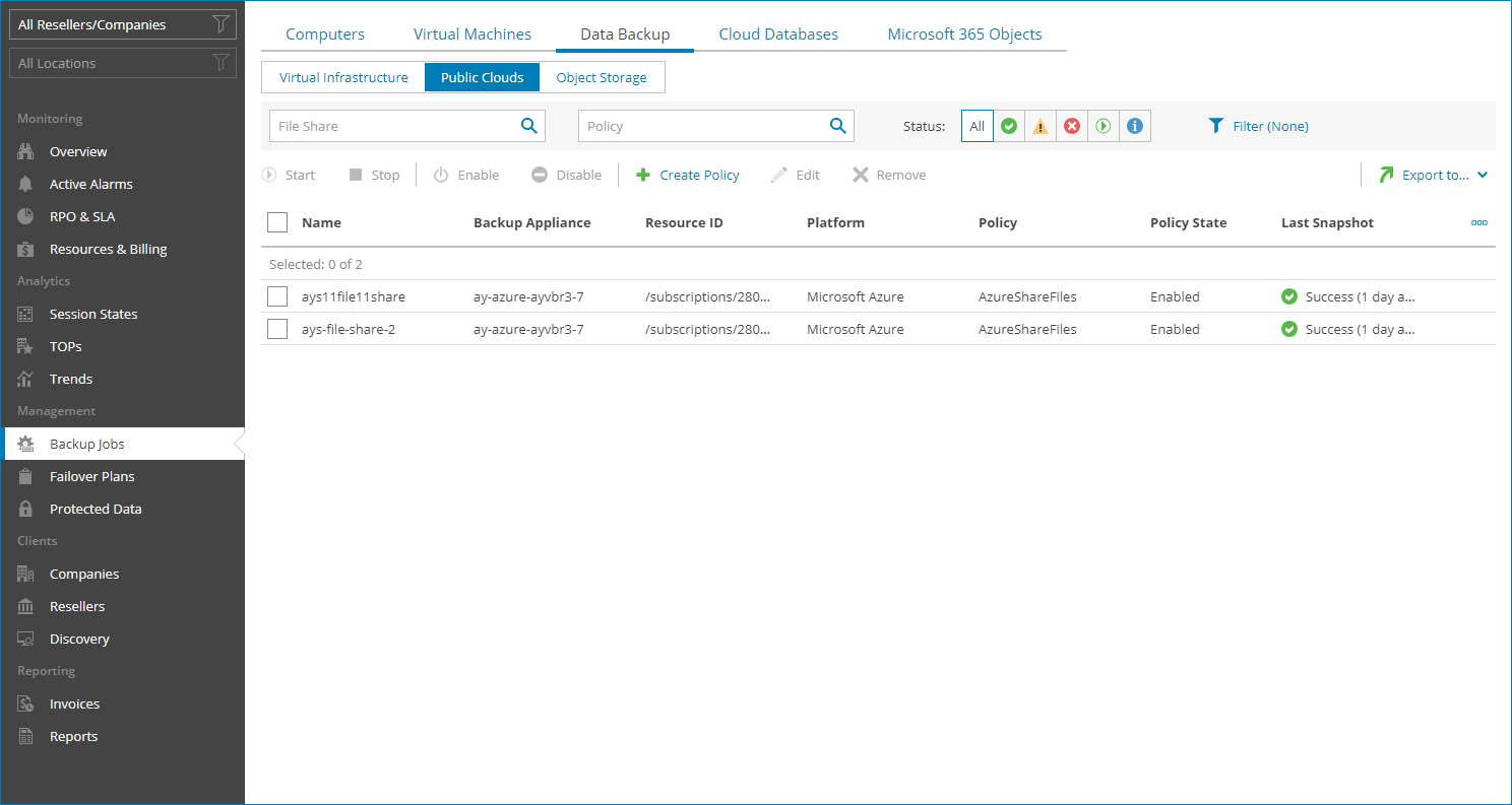 Veeam Service Provider Console will display a list of all policies configured to store file backups on external repositories integrated with managed backup servers.