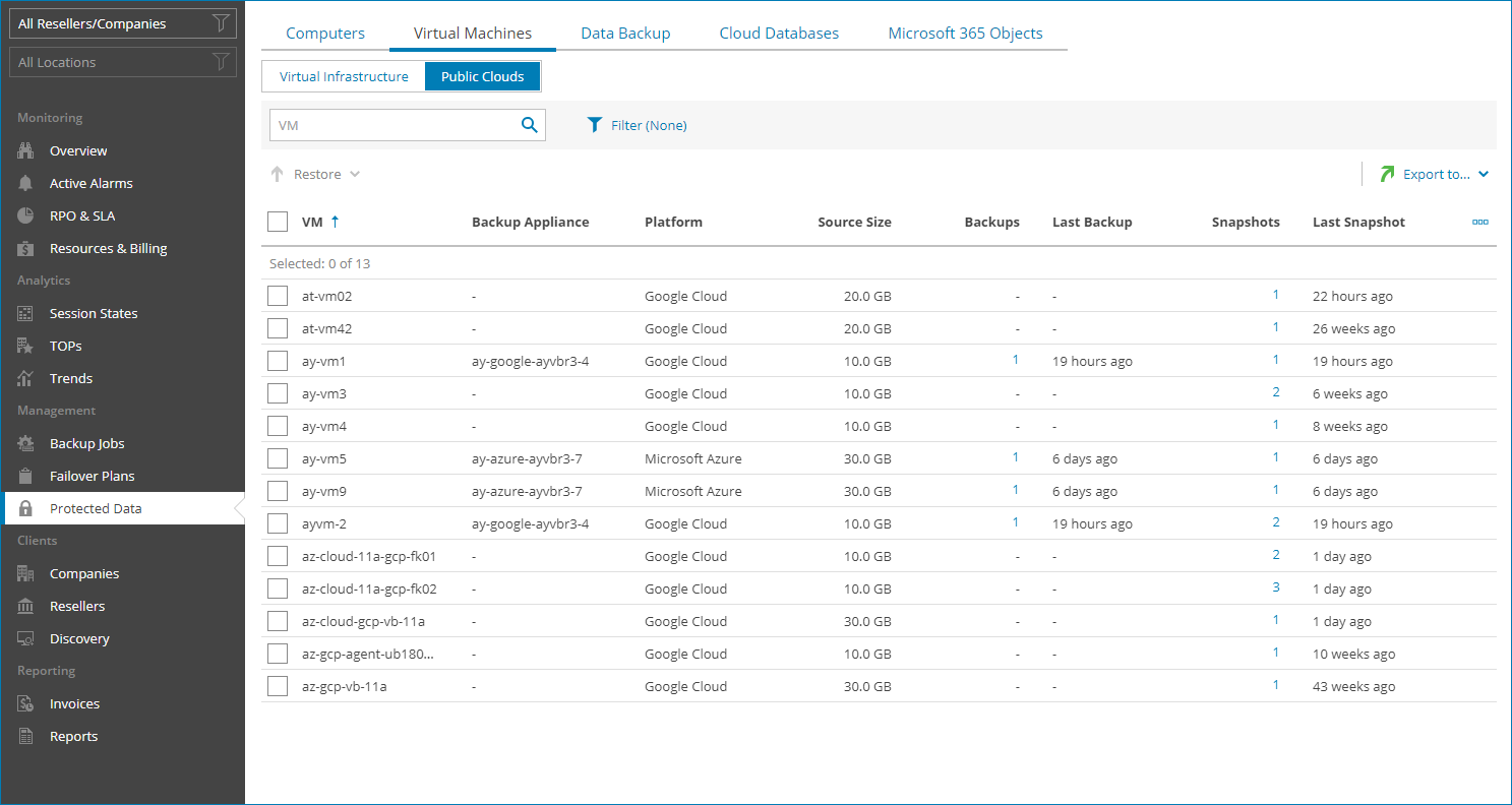 Veeam Service Provider Console will display a list of all VMs protected by managed backup servers.