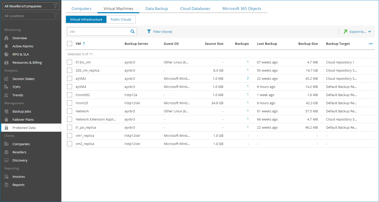 Veeam Service Provider Console will display a list of all VMs protected by managed backup servers.