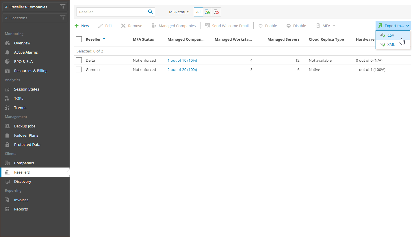 - To export reseller details, click Export to and choose a format of the exported data: