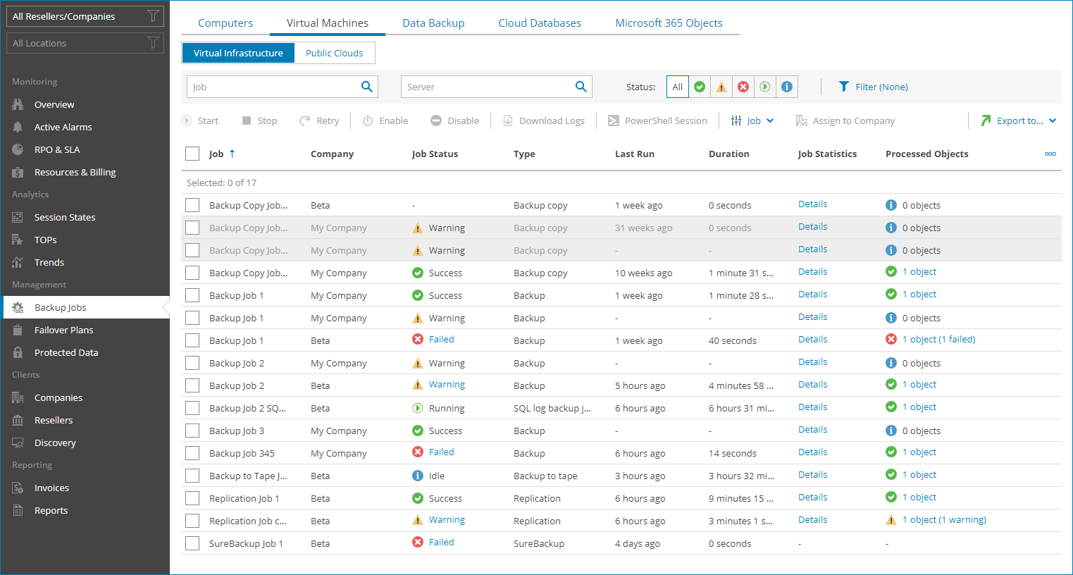 Veeam Service Provider Console will display a list of all VM jobs configured on managed backup servers.