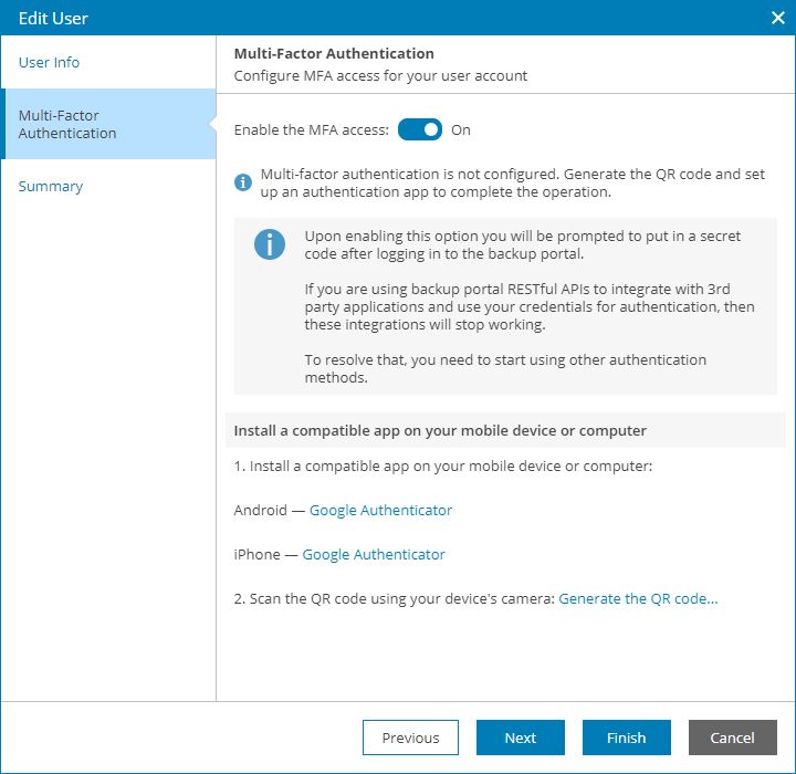 - Set the Enable the MFA access toggle to On and click the Generate the QR code link.