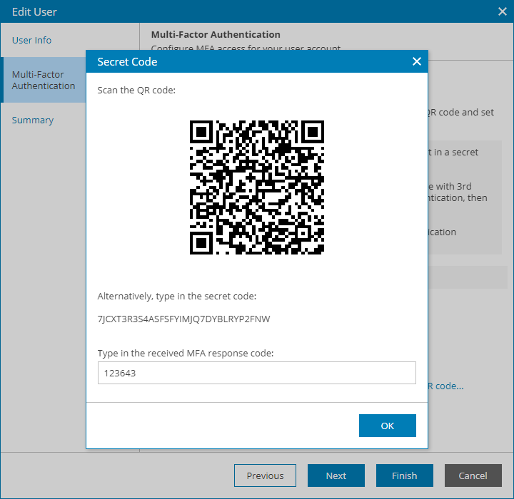 - In the Secret Code window, type in the response code generated by the authenticator application and click OK.