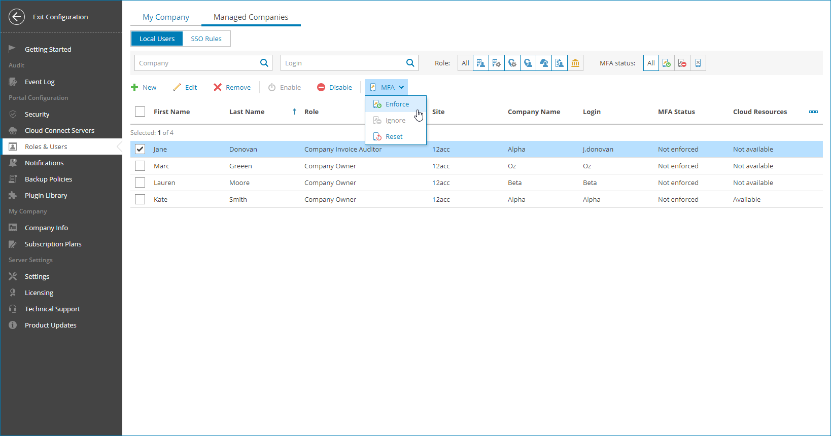 If the Enforce MFA for all managed clients and resellers policy is enabled or MFA is enabled for the reseller that manages the selected companies, you cannot disable MFA. For details, see MFA Policies. If MFA is enabled for the company by your service provider, you cannot disable MFA. |
