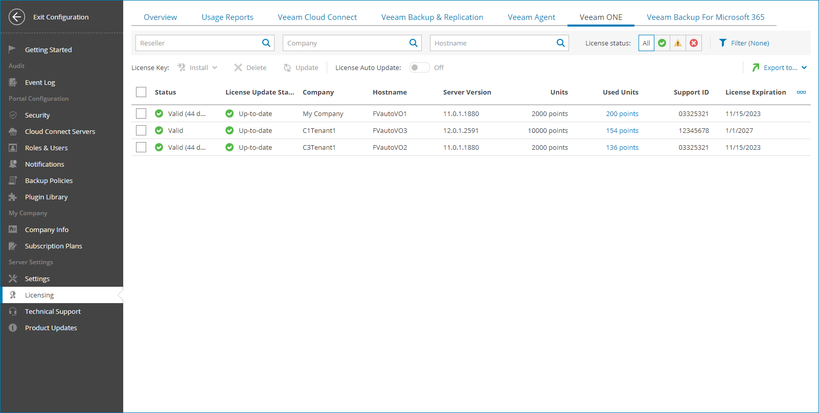 - Hostname — name of a Veeam ONE server for which license details are provided.
