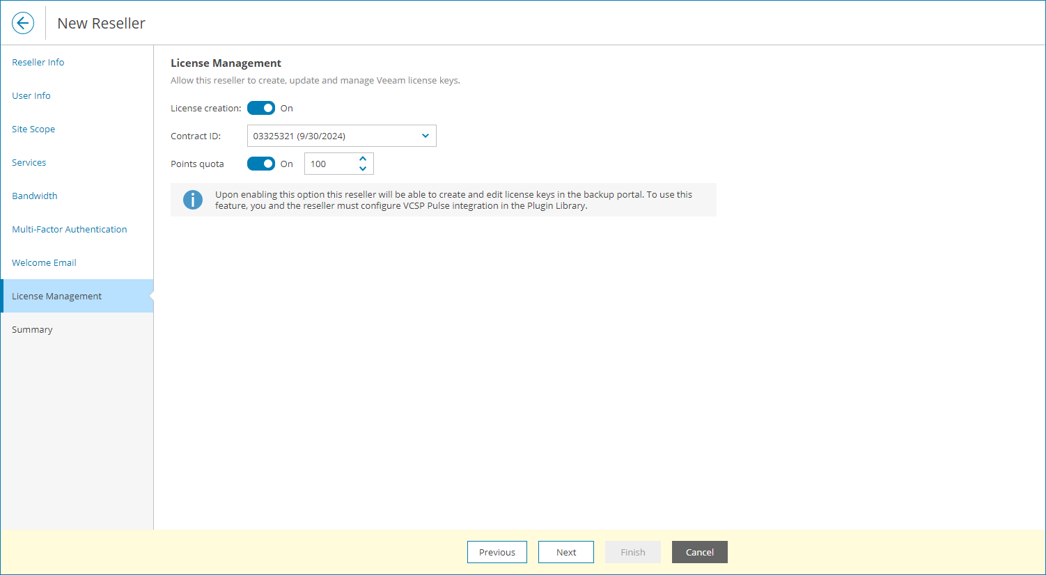 At the License Management step of the wizard, you can assign to the reseller a VCSP Pulse contract that will allow the reseller to create and manage license keys for tenant companies in VCSP Pulse plugin.