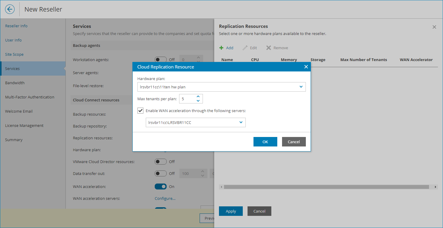In the Replication Resources window, you can assign to the reseller one or more hardware plans. A reseller can subscribe managed companies to assigned hardware plans.