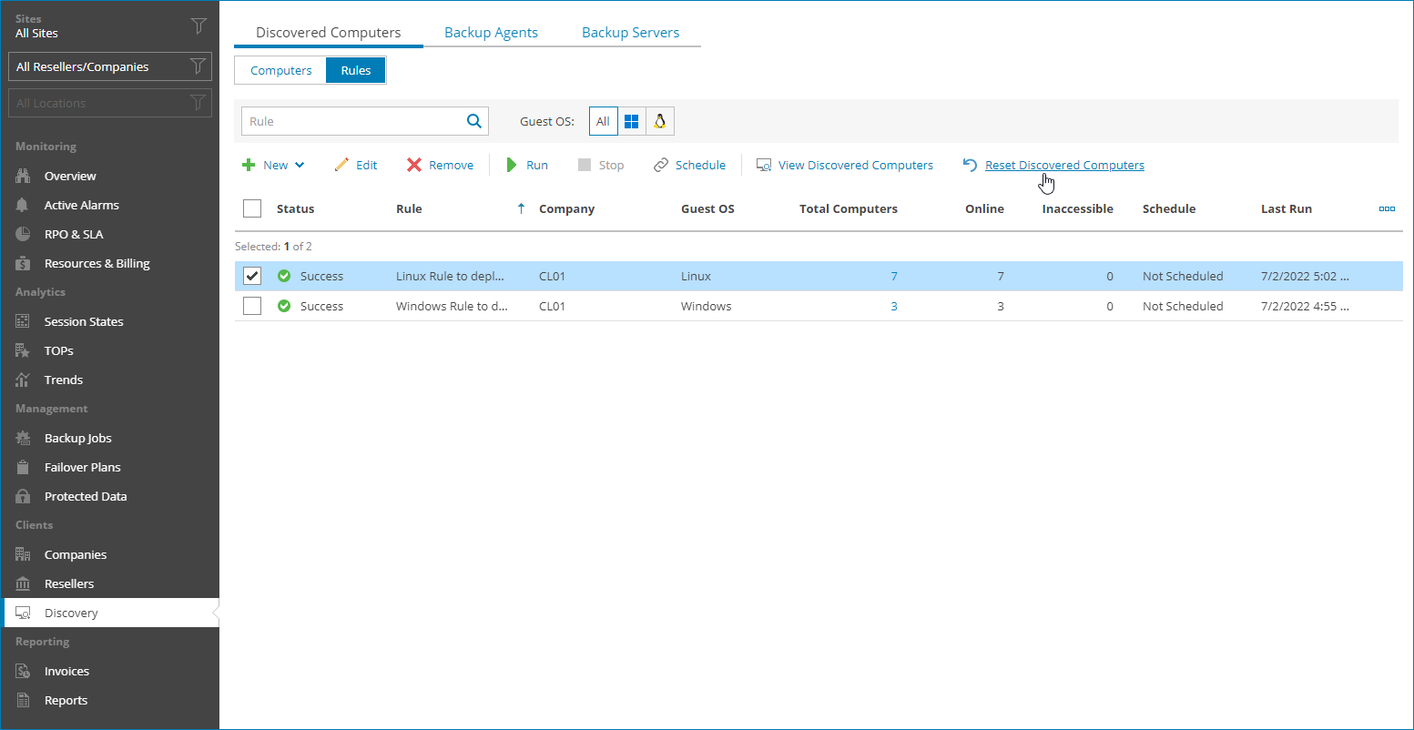 When you perform reset for a discovery rule, computers discovered with this rule are removed from the discovered computers list. However, computers on which Veeam Service Provider Console management agents are already installed and configured to communicate with Veeam Service Provider Console will be moved to the list of computers discovered by the External Discovery rule.