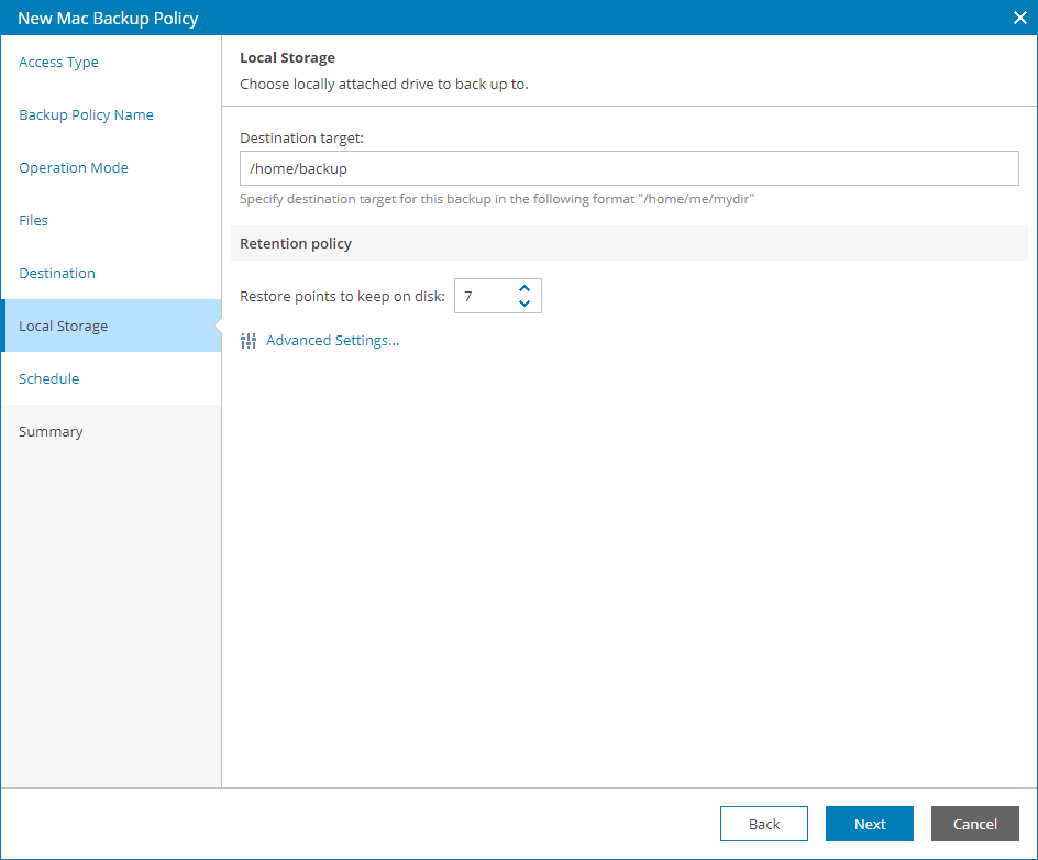 The Local Storage step of the wizard is available if at the Destination step you have chosen to save the backup on a local drive of the computer.