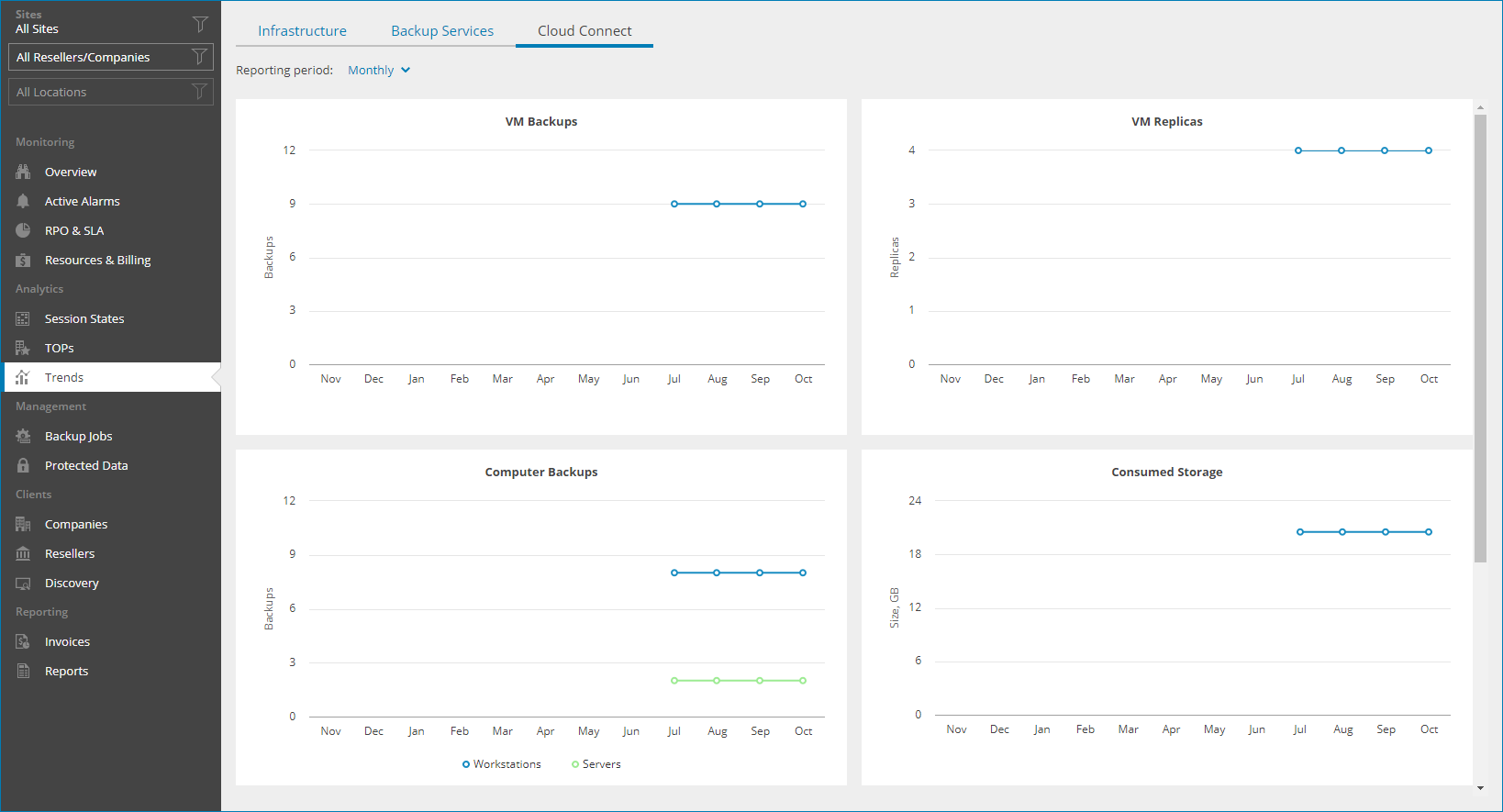 - VM Backups widget shows how the number of VMs backed up to cloud repositories has been changing during the reporting period.