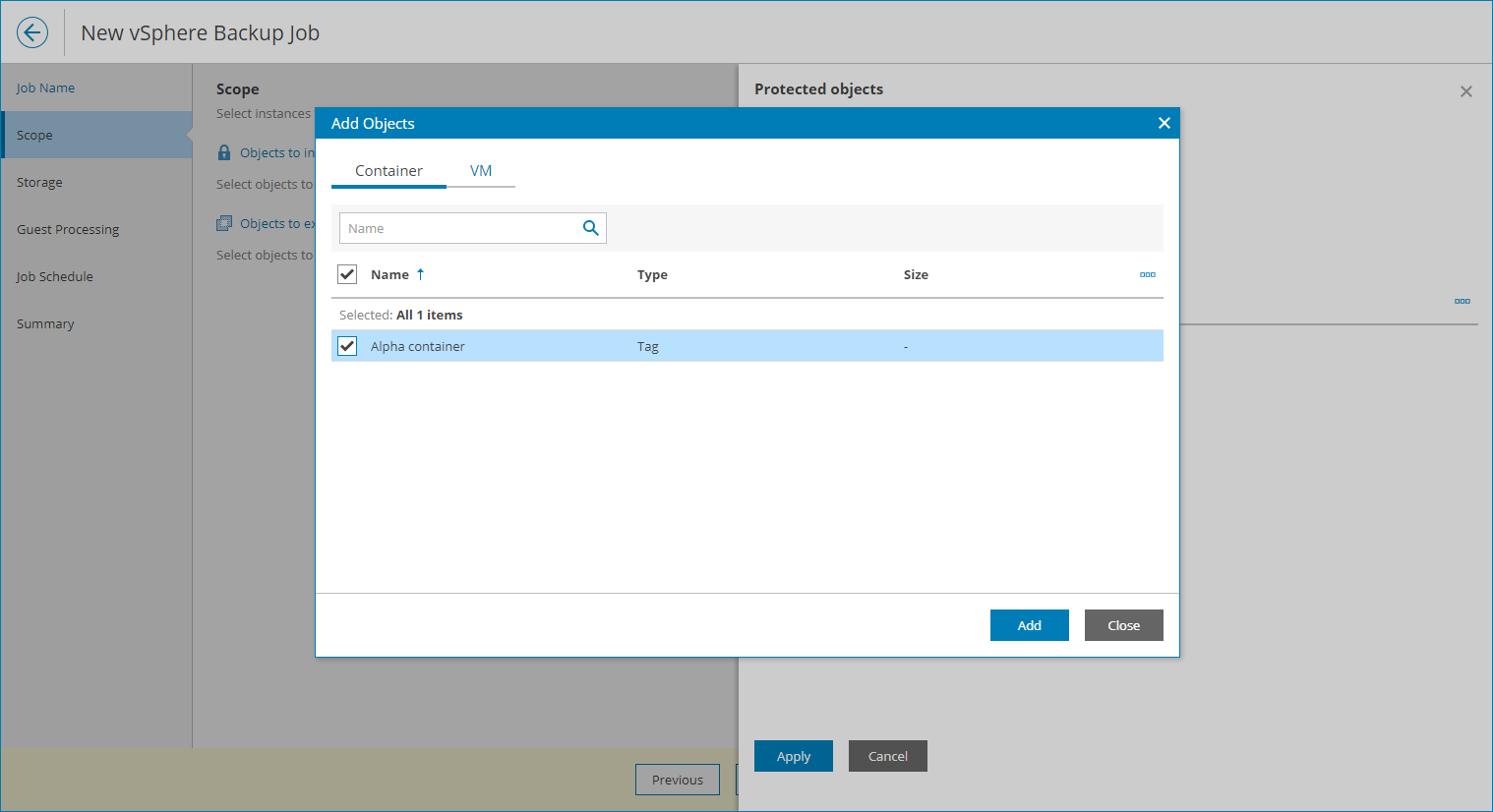 - In the Add Objects window, specify objects that you want to include in the backup scope: