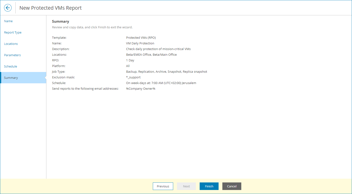 - At the Summary step of the wizard, review the report configuration and click Finish.