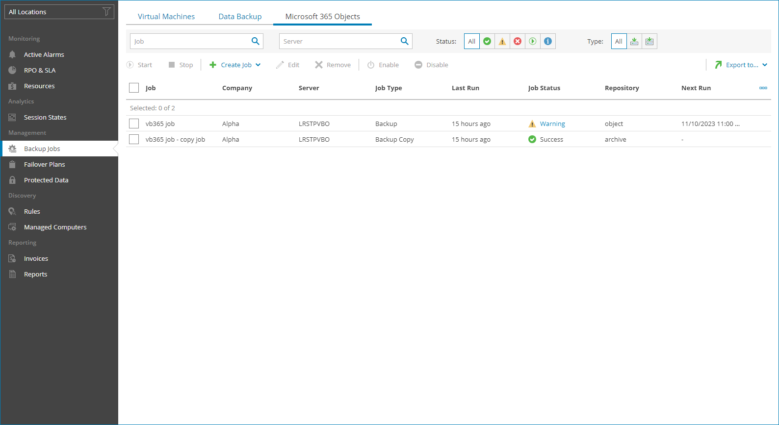 Veeam Service Provider Console will display a list of all file jobs configured on managed Veeam Backup for Microsoft 365 servers.