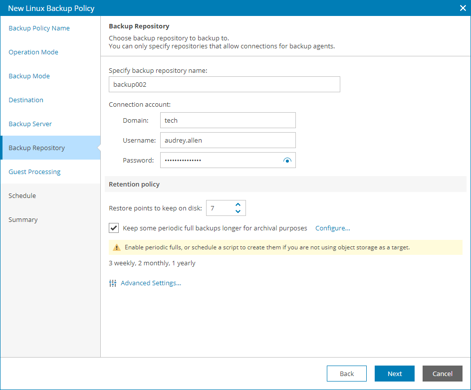 Permissions on the backup repository managed by the target Veeam backup server must be granted beforehand. For details, see section Setting Up User Permissions on Backup Repositories of the Veeam Agent for Linux User Guide.
