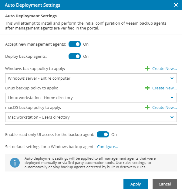 If you install Veeam Service Provider Console management agents outside Veeam Service Provider Console (manually or using 3rd party automation tools), you can configure auto deployment settings. Auto deployment settings define whether Veeam Service Provider Console must automatically register new management agents, and whether registered management agents must automatically install Veeam backup agent on hosting computers and assign a backup policy.