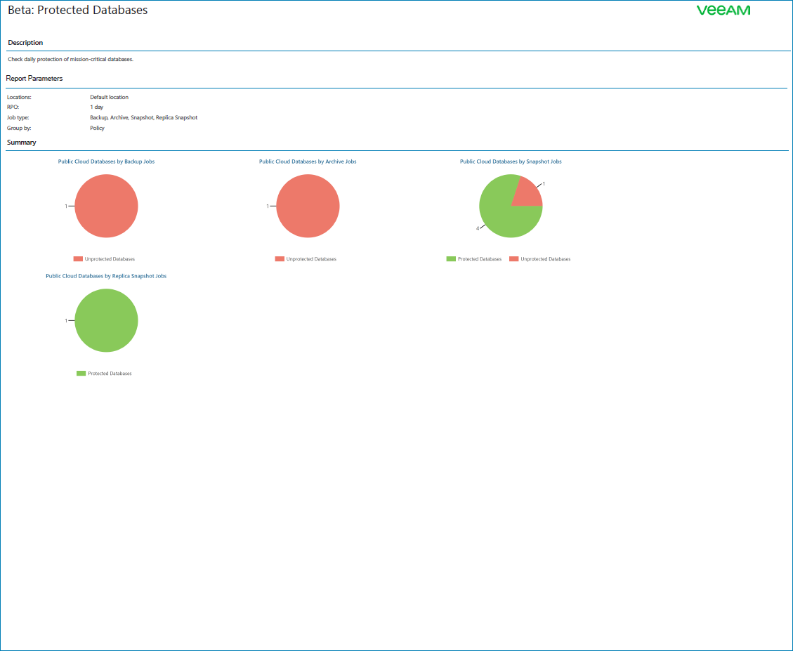 - The report charts display information about the number of databases protected with backup jobs, archive backup jobs, snapshots and replica snapshots.