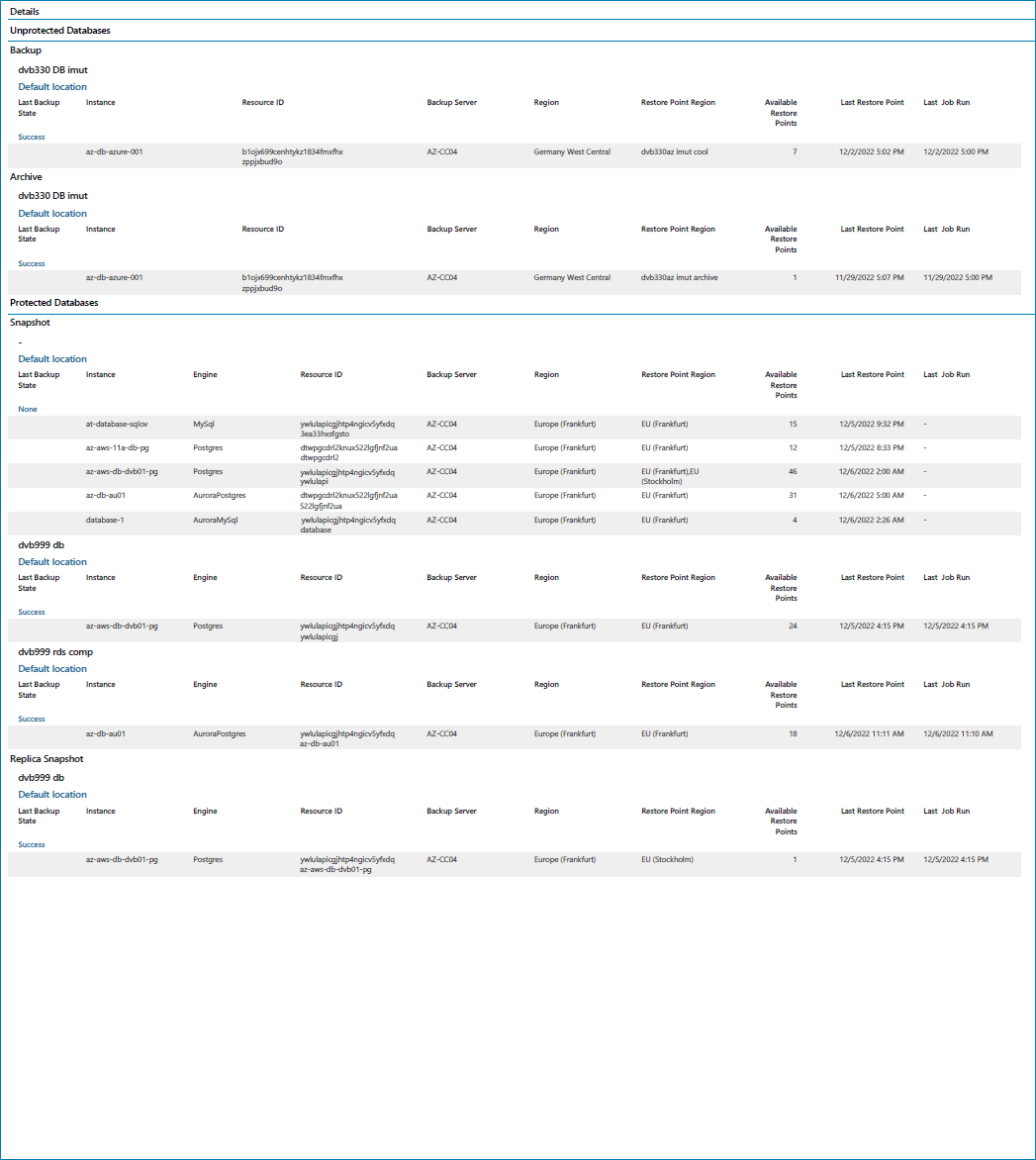 - The Details section provides information about all protected and unprotected databases including instance name, region and resource ID, backup server name, restore point region, number of available restore points and date and time of the latest restore point and job run.