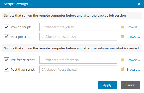 - In the Post-job script field, specify a path to the script that should be executed after the backup job completes.