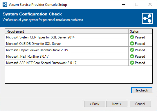Before proceeding with the installation, the installer will perform system configuration check to determine if all prerequisite software is available on the machine. To learn what software is required for Veeam Service Provider Console, see Veeam Service Provider Console Release Notes.