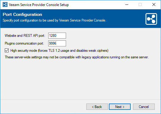 - To enforce TLS 1.2 encryption protocol and disable weak ciphers for all communications with the machine on which Veeam Service Provider Console Web UI component runs, select the High security mode check box.