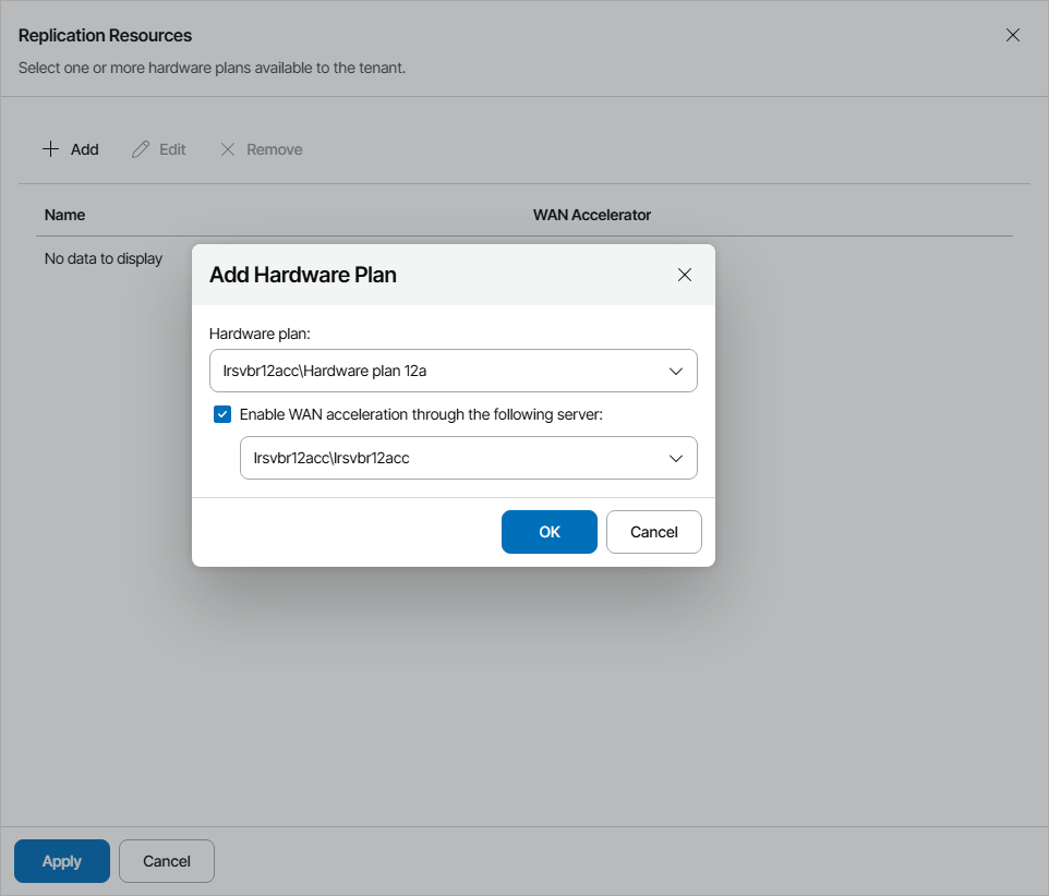 Hardware plans must be configured in Veeam Cloud Connect in advance. For details, see section Configuring Hardware Plans of the Veeam Cloud Connect Guide.