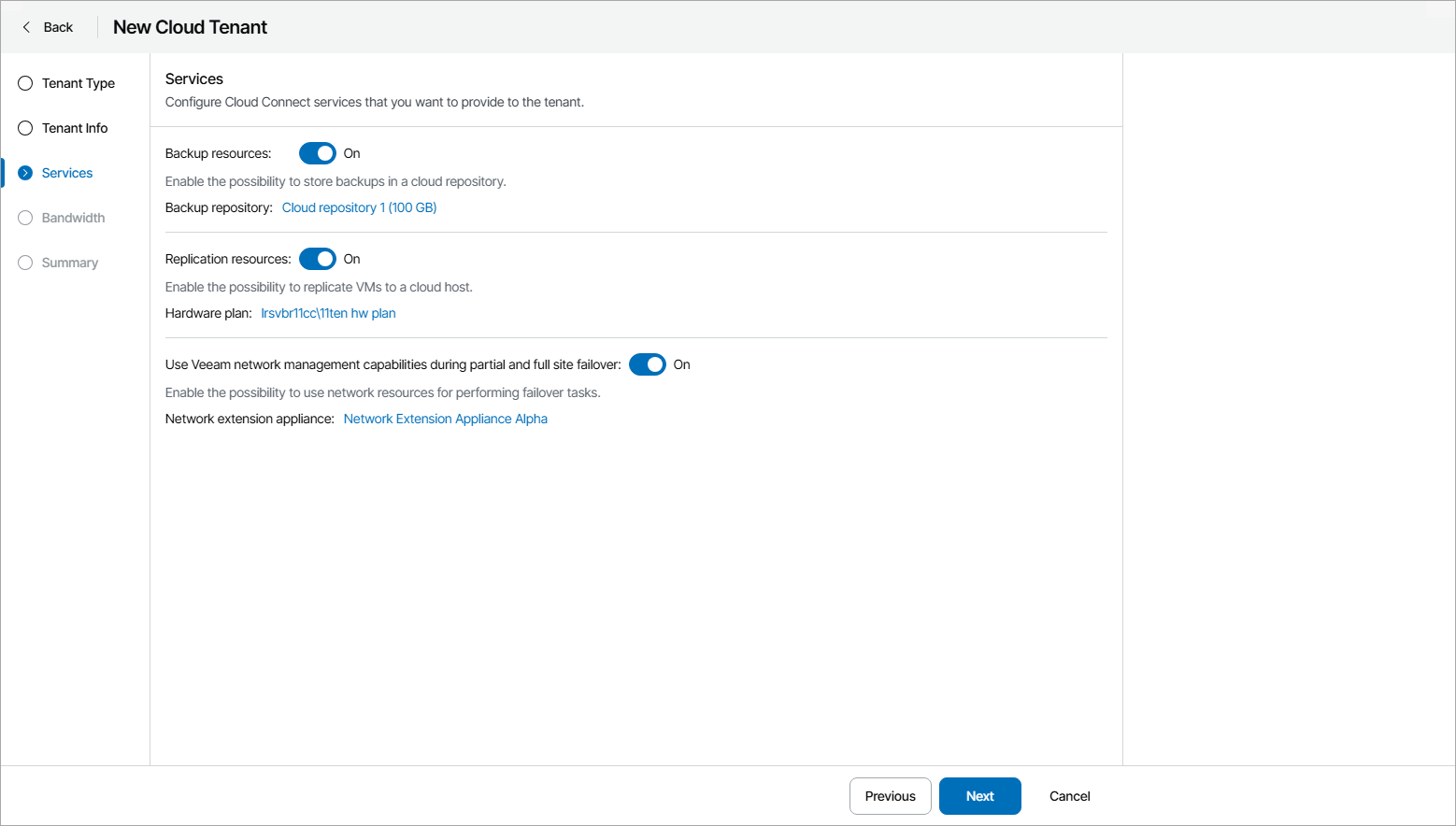- To allow the cloud tenant to use cloud backup resources, set the Backup resources toggle to On.