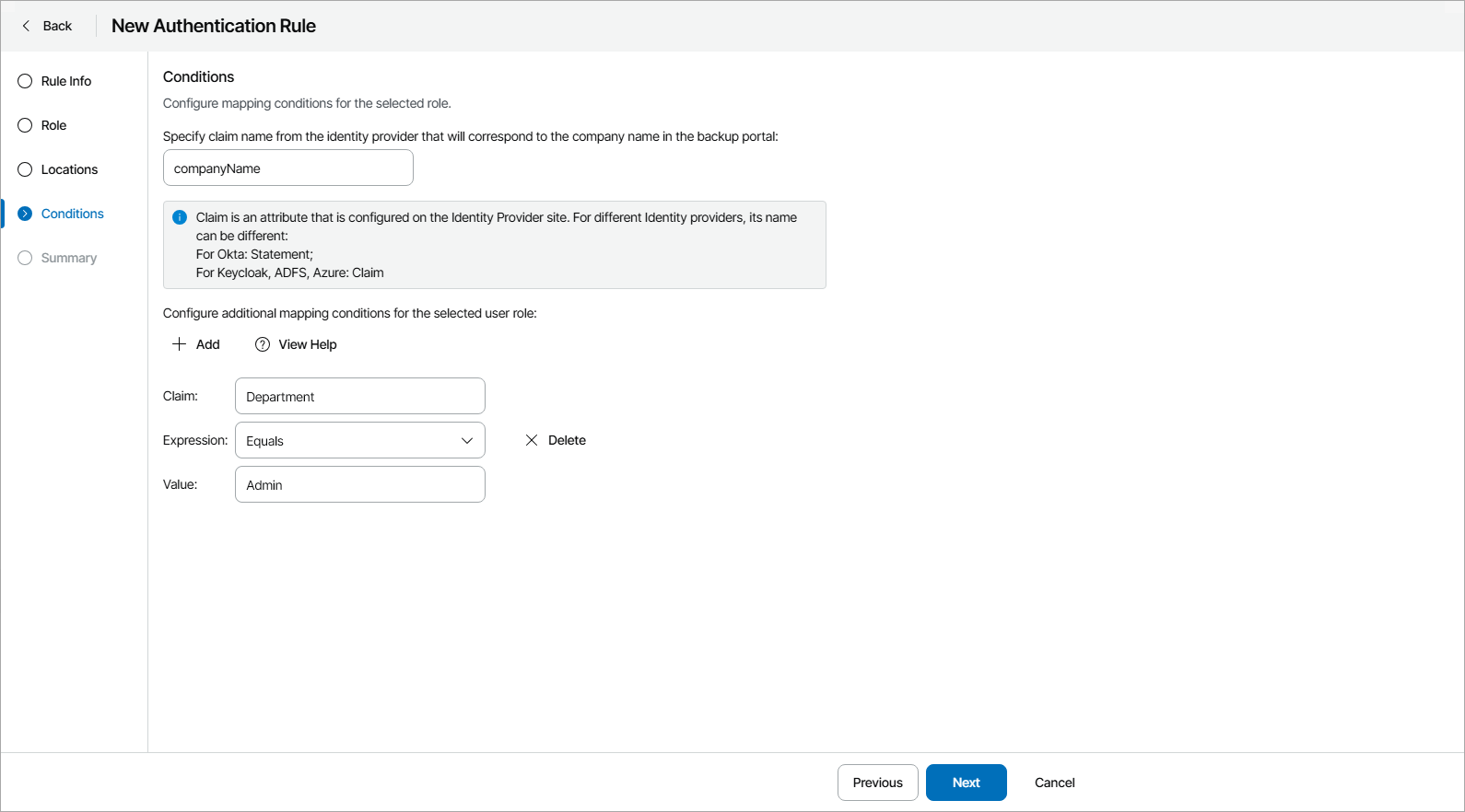 3. At the Conditions step of the wizard, specify the claim name of the claim configured on step 28 and configure mapping conditions.
