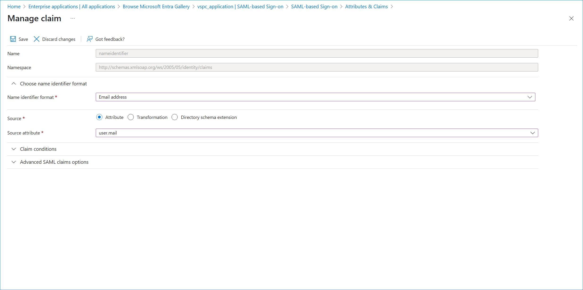 3. Click the Unique User Identifier (Name ID) claim to modify claim settings.