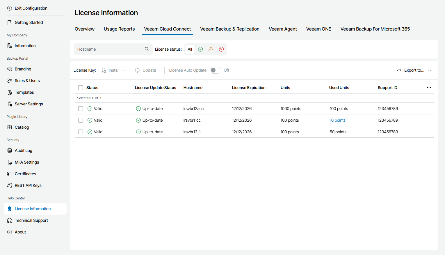 - Status — status of license installed on the Veeam Cloud Connect server (Valid, Warning, Error).