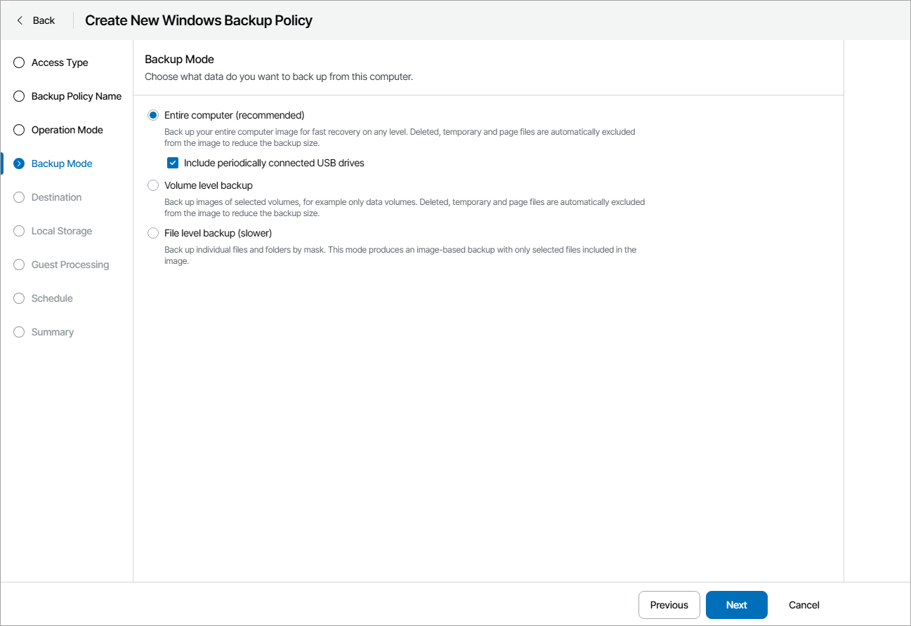 At the Backup Mode step of the wizard, select the mode in which you want to create a backup: