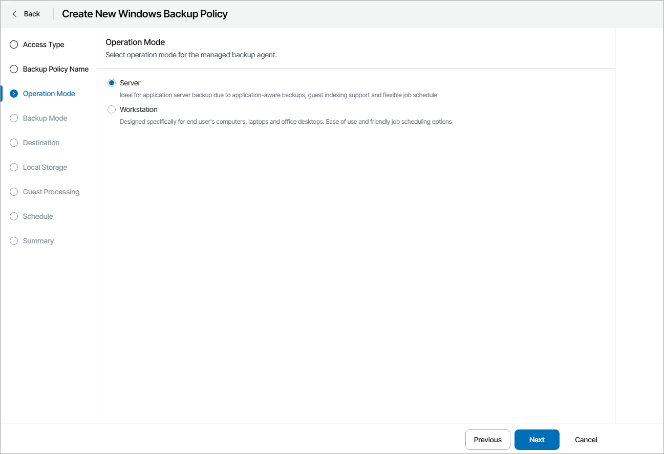 This mode supports application-aware processing, files indexing and flexible backup job schedule, and is designed to protect application servers.