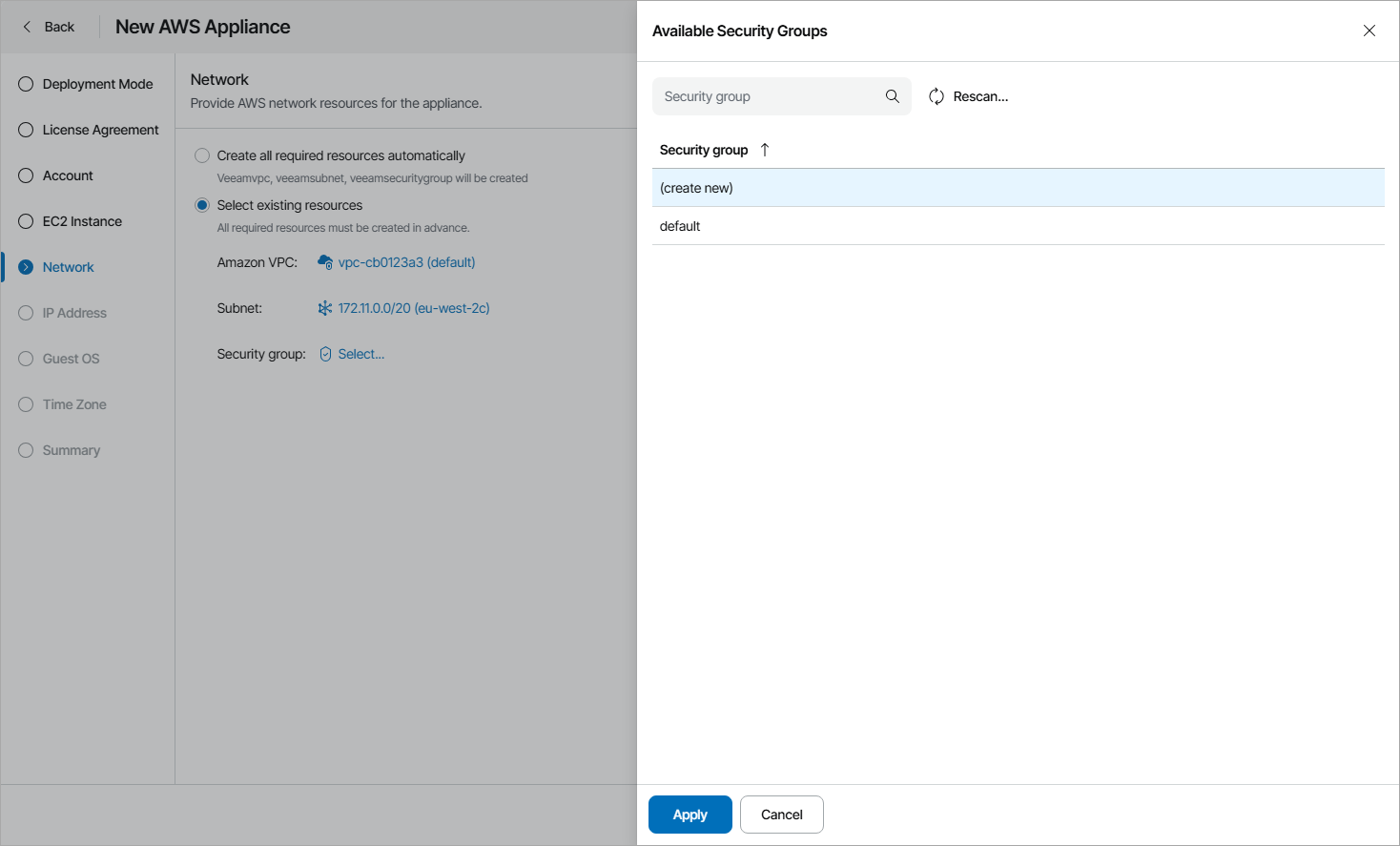 In the Amazon VPC, Subnet and Security group fields, click Select, choose the necessary resource and click Apply. If you want to create a new resource automatically, choose (select new).