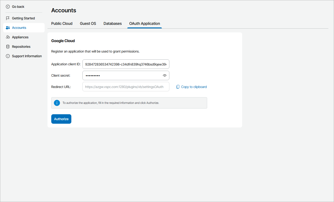 - In Veeam Service Provider Console, specify the configured credentials in the Application client ID and Client secret fields.