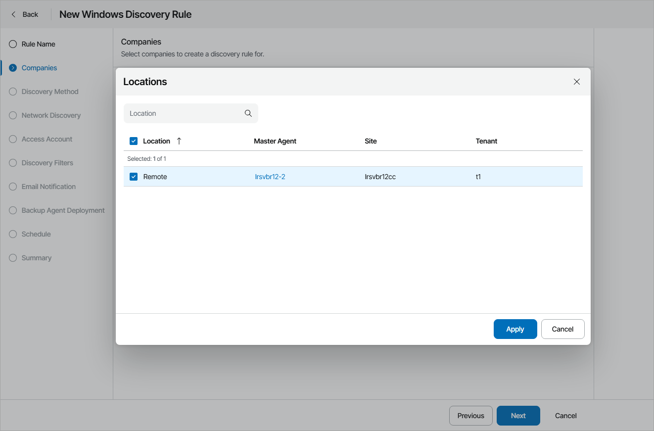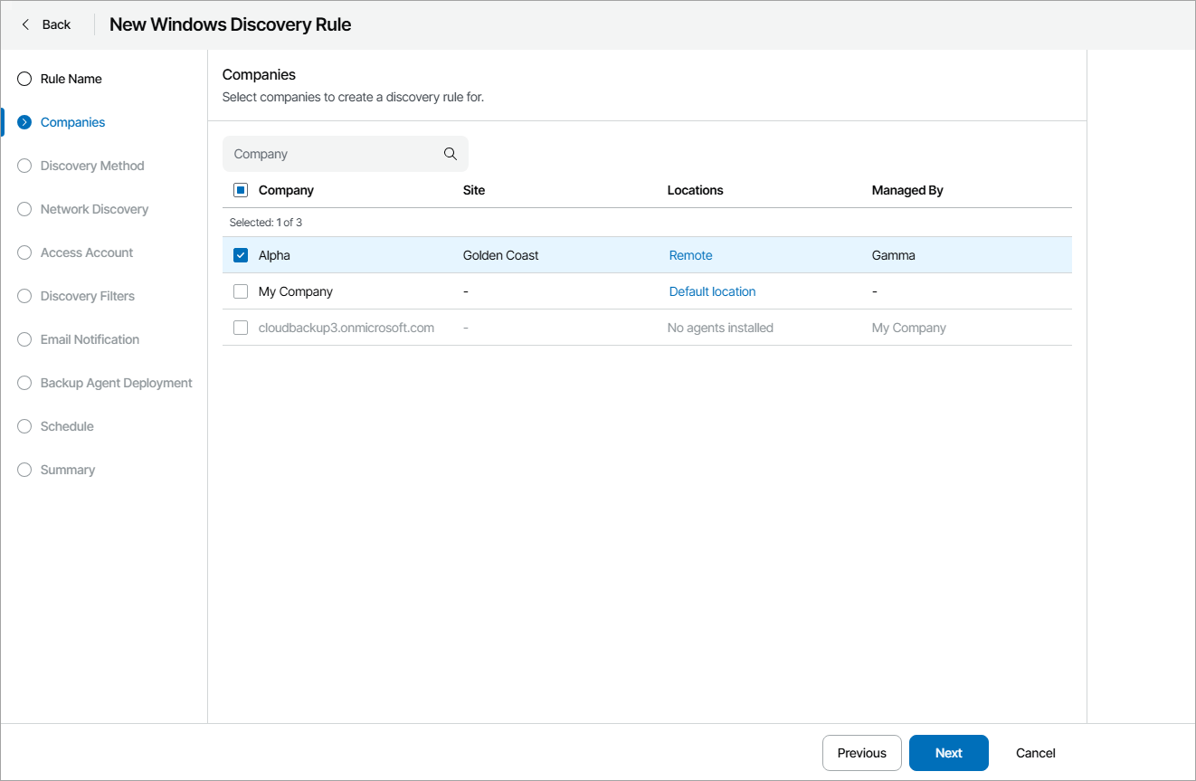 - At the Companies step of the wizard, choose one or more companies for which the discovery rule is configured. Use the search field at the top of the list to find the necessary companies.