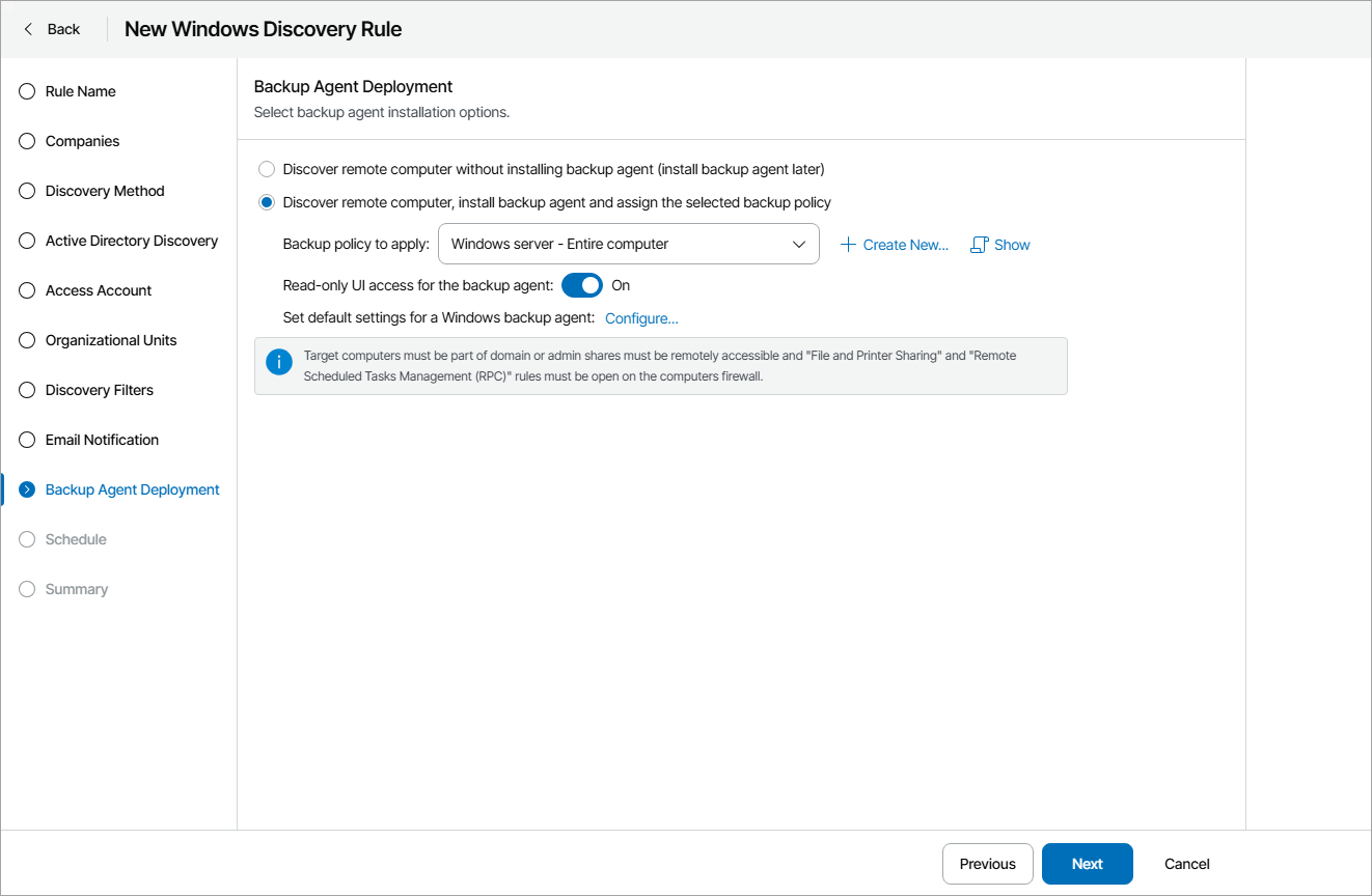 - If after discovery Veeam backup agents must be installed automatically, select the Discover remote computer, install backup agent and assign the selected backup policy option.